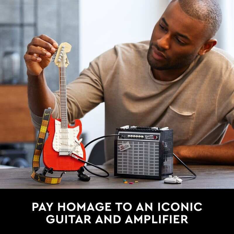 - This 1,079-piece set comes with a booklet about the history of the Fender® Stratocaster® guitar, the set’s fan designer and LEGO® designers, plus step-by-step instructions for a joyful build.