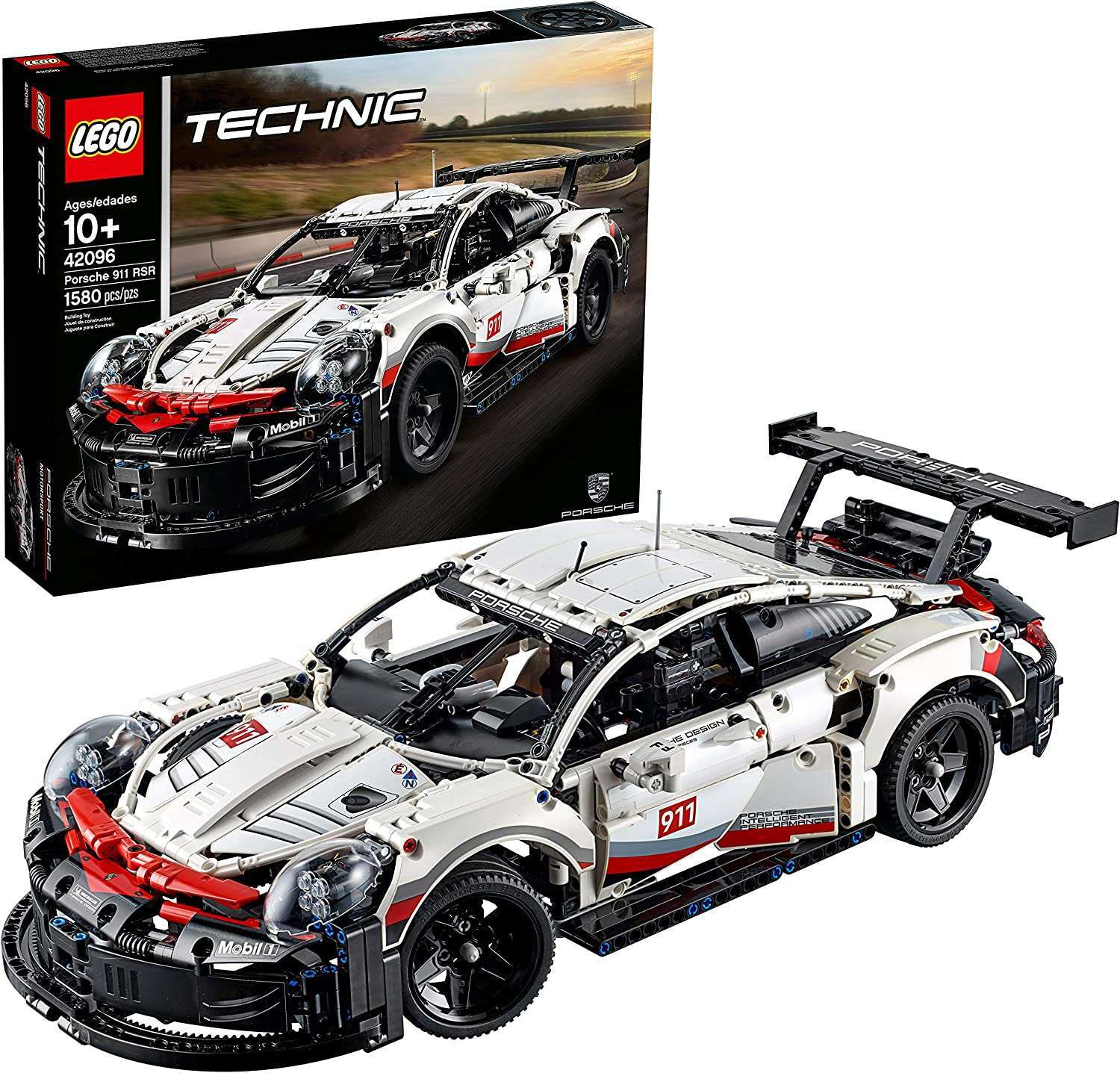 Celebrate an icon of engineering excellence with the LEGO© Technic™ 42096 Porsche 911 RSR. Developed in partnership with Porsche, this authentic replica captures the vehicle's powerful appearance with its sharp contours and aerodynamic detailing, including a rear wing with ?swan neck' mounts, extended rear diffuser and specially designed side mirrors. Functions include a visible, working differential, independent suspension and a six-cylinder boxer engine with moving pistons positioned in front of the rear axle, while the accessible cockpit features a radar screen, working steering, fire extinguisher system and even a track map of the Laguna Seca circuit printed onto the driver's door. Black spoked rims, realistic head and tail lights and an authentic white, red and black color scheme with sticker detailing add the final touches to this awesome LEGO Technic Porsche 911 RSR model, a perfect display piece for the home or office!me or office!